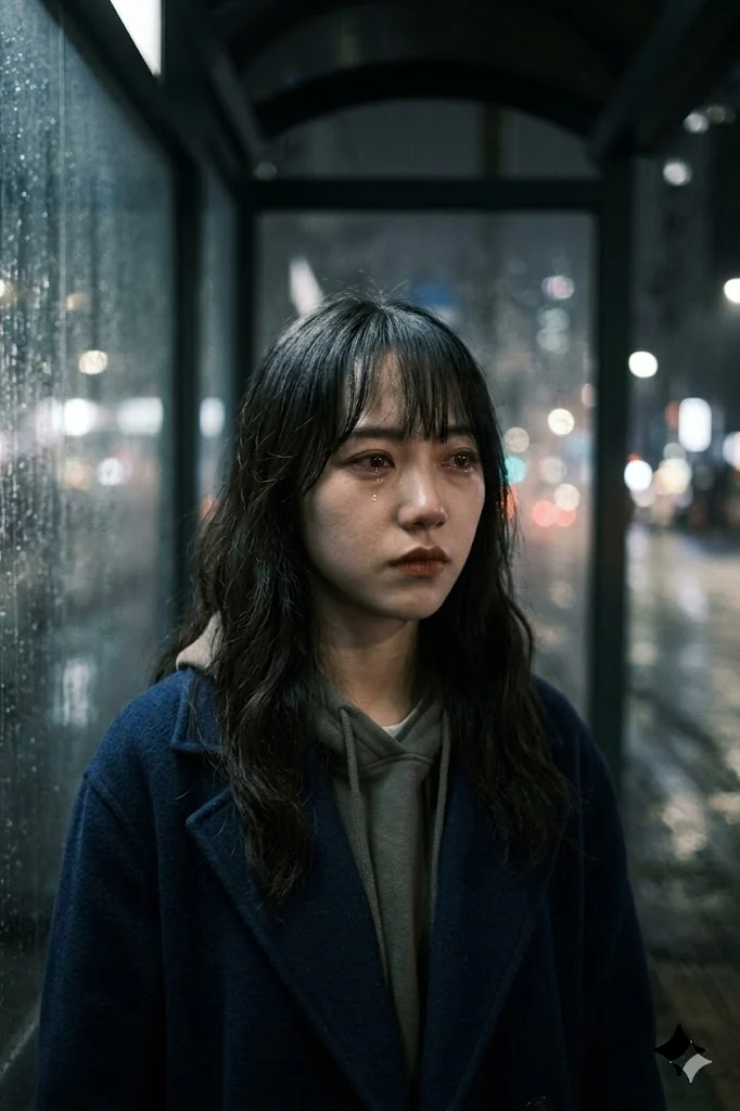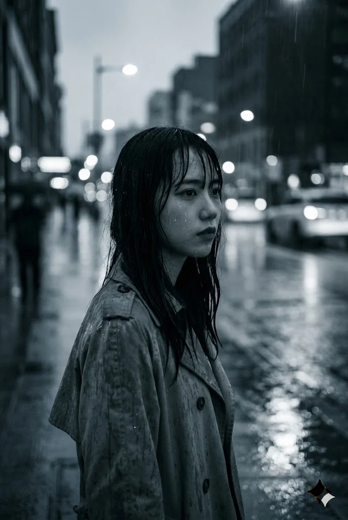 雨把城市洗得发冷,我在路灯下看见你——同一张脸,却像隔着好几年的距离。
